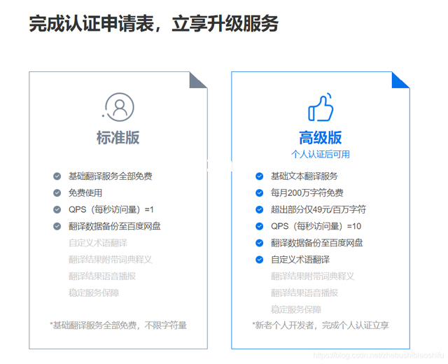 如下圖,可以看到如果認證了個人身份,即可使用高級版的翻譯接口。