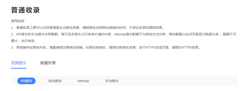 站長平臺的普通收錄工具可以幫助站長們主動向百度搜索推送內容資源,縮短搜索蜘蛛發現網頁內容的時間,提交方式包括API提交、手動提交、sitemap、自動推送等四種方式。
