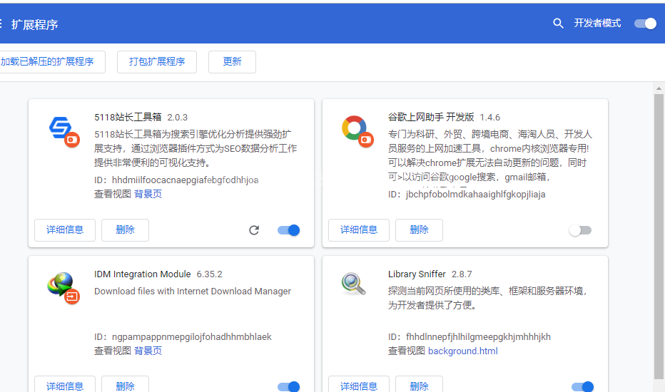 4,插件安裝完成,并成功啟動插件服務。如果提示安裝不了,記得右上角勾選,開發者模式。