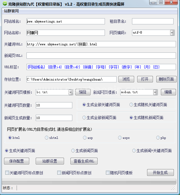 從截圖中可以看到克隆俠泛目錄程序的一些特色,自定義后綴文件名、自動插入標點偽原創、多模板隨機等等。
