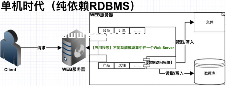 草根時期,快速開發網站并上線。當然,通常只是先試水,用戶規模也沒有形成,經濟能力和投入也非常有限。應用程序、數據庫、文件等所有資源都集中在一臺 Server上,典型案例:基于 LAMP 架構的 PHP 網站;