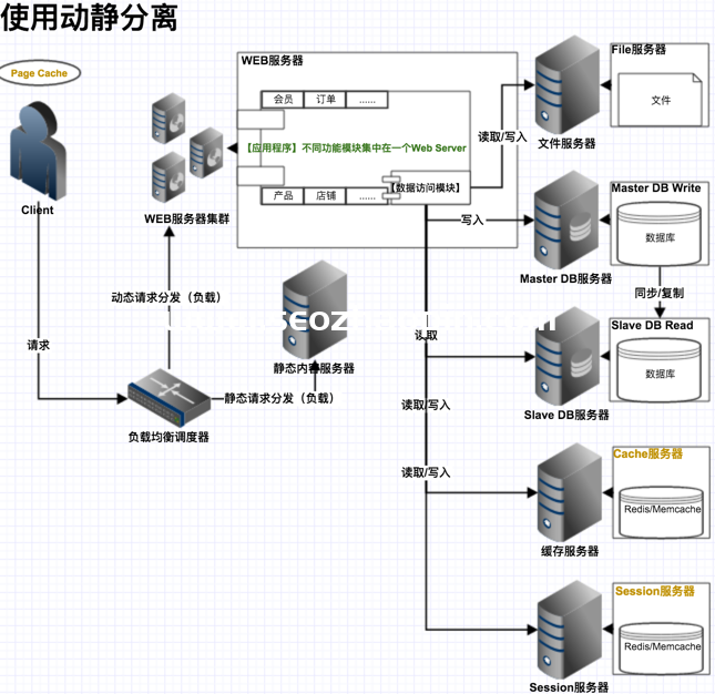 2.再大一點,考慮到數據庫服務器和應用服務器的分離,每個服務器都設置好了,可以再增加一個服務器,把靜態請求和動態請求分開;