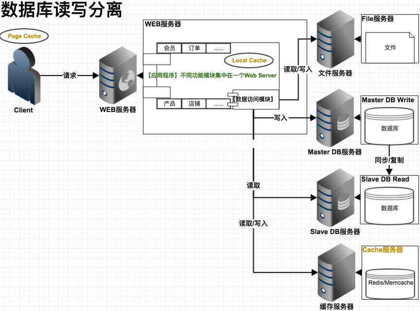 6.如果部署N個緩存服務器后數據庫仍然有壓力,可以考慮讀取數據庫的寫分李,一個主服務器寫,N個從服務器讀。當然,你必須做好數據同步;