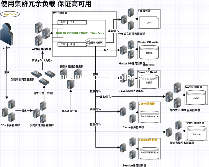 只有一臺服務器對多臺服務器才能支持網站的現有數據、用戶和頁面請求。大型網站(如淘寶, 京東,等)的系統架構。)不具備高性能、高可用性、安全性等完整特征。