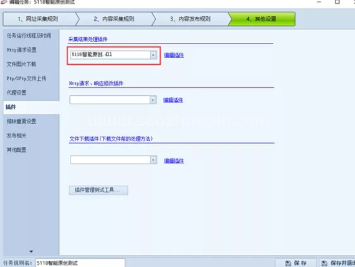 第三步,選擇已有采集任務,在【其他設置】的左側欄目中選擇插件,在采集結果處理插件下拉框中,選擇【5118智能原創.dll】,點擊保存即可。
